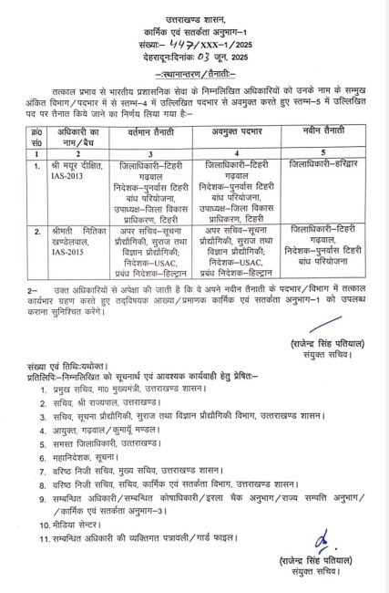 देहरादून/टिहरी। उत्तराखंड शासन द्वारा 3 जून 2025 को भारतीय प्रशासनिक सेवा के दो अधिकारियों के तबादले किए गए हैं। आदेश संख्या 447/XXX-1/2025 के अनुसार श्री मयूर दीक्षित (आईएएस-2013), जो वर्तमान में जिलाधिकारी टिहरी गढ़वाल के पद पर कार्यरत थे, को अब जिलाधिकारी हरिद्वार बनाया गया है।