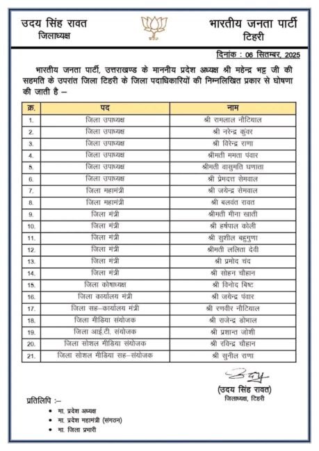 भाजपा जिला टिहरी की नई जिला कार्यकारिणी घोषित