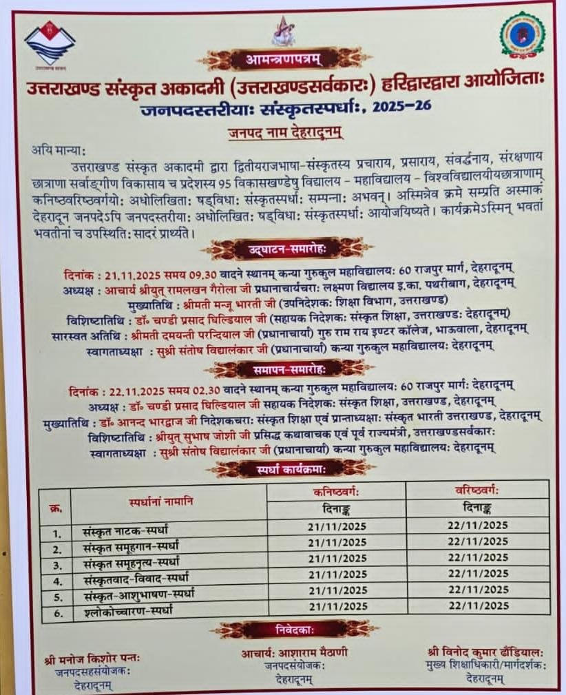 जनपद स्तरीय संस्कृत छात्र प्रतियोगिताओं का आगाज 21 एवं 22 नवंबर को देहरादून से होगा
