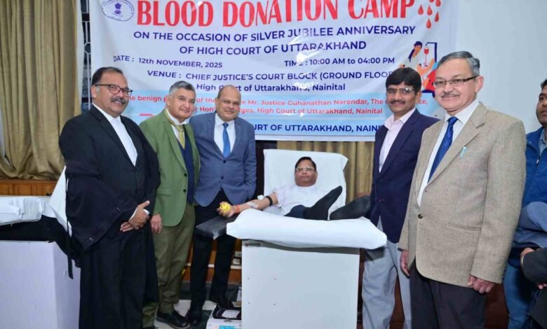 देहरादून, 12 नवंबर 2025 । उत्तराखंड उच्च न्यायालय परिसर में आज एक रक्तदान शिविर का आयोजन किया गया, जिसका उद्देश्य स्वैच्छिक रक्तदान को प्रोत्साहित करना और इसके महत्व के प्रति जनजागरूकता बढ़ाना था।शिविर का आयोजन उत्तराखंड उच्च न्यायालय द्वारा अपनी कॉर्पोरेट सामाजिक उत्तरदायित्व (CSR) पहल के तहत किया गया।