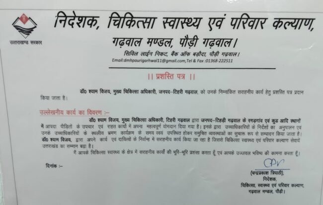 टिहरी गढ़वाल। जनपद टिहरी गढ़वाल के मुख्य चिकित्सा अधिकारी डॉ. श्याम विजय को आपदा प्रबंधन एवं चिकित्सा सेवाओं के क्षेत्र में उत्कृष्ट कार्यों के लिए प्रशस्ति पत्र प्रदान किया गया है। यह प्रशस्ति पत्र उन्हें निदेशक, चिकित्सा स्वास्थ्य एवं परिवार कल्याण, गढ़वाल मण्डल, पौड़ी गढ़वाल द्वारा प्रदान किया गया।