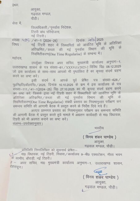 इससे पूर्व पुनर्वास निदेशक कार्यालय के पत्र संख्या 628/पुनि.टि.बॉ.परि./2025 (दिनांक 10.10.2025) के जवाब में आयुक्त कार्यालय ने 27 अक्टूबर 2025 को पत्र संख्या 111/41-1(2024-25) जारी कर समन्वय समिति में प्रस्ताव रखने के निर्देश दिए थे। पत्र की प्रतिलिपि विधायक टिहरी तथा अपर सचिव, मुख्यमंत्री कार्यालय को भी भेजी गई है।