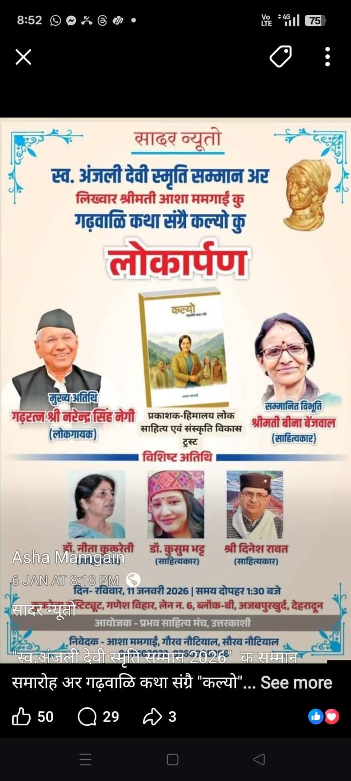 आशा ममगाईं के गढ़वाली कथा-संग्रह ‘कल्यो’ का लोकार्पण कल देहरादून में