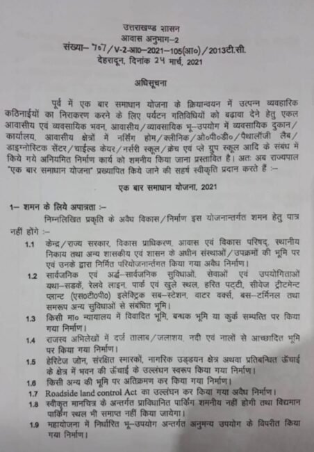 कांग्रेस प्रवक्ता के अनुसार गढ़वाल मंडल आयुक्त द्वारा जिलाधिकारी टिहरी को भेजे गए पत्र में नई टिहरी शहर में आवंटित भूमि से अतिरिक्त अतिक्रमण के मामलों को समन्वय समिति की बैठक में रखने की बात कही गई है। उन्होंने कहा कि वर्तमान पुनर्वास नीति और राज्य सरकार की एक बार समाधान योजना-2021 में ऐसे अतिक्रमण को शमन करने का कोई स्पष्ट प्रावधान नहीं है।