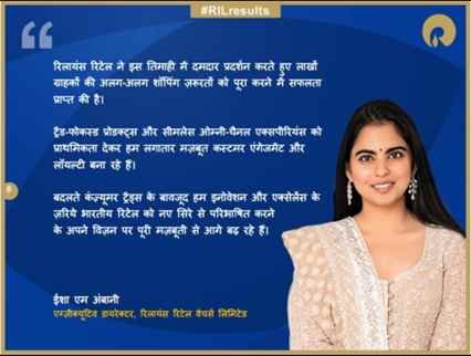 रिजल्ट्स पर टिप्पणी करते हुए रिलायंस रिटेल वेंचर्स लिमिटेड की एग्ज़ीक्यूटिव डायरेक्टर ईशा एम. अंबानी ने कहा “रिलायंस रिटेल ने इस तिमाही में दमदार प्रदर्शन करते हुए लाखों ग्राहकों की अलग-अलग शॉपिंग ज़रूरतों को पूरा करने में सफलता प्राप्त की है। ट्रेंड-फोकस्ड प्रोडक्ट्स और सीमलेस ओम्नी-चैनल एक्सपीरियंस को प्राथमिकता देकर हम लगातार मज़बूत कस्टमर एंगेजमेंट और लॉयल्टी बना रहे हैं। बदलते कंज़्यूमर ट्रेंड्स के बावजूद हम इनोवेशन और एक्सेलेंस के ज़रिये भारतीय रिटेल को नए सिरे से परिभाषित करने के अपने विज़न पर पूरी मज़बूती से आगे बढ़ रहे हैं।”