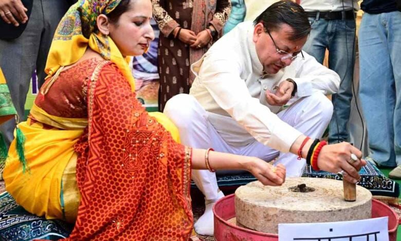 देहरादून 23 मार्च,2026 । मुख्यमंत्री श्री पुष्कर सिंह धामी ने राजधानी देहरादून स्थित परेड ग्राउंड में आयोजित “सरकार के 4 साल बेमिसाल” कार्यक्रम के अंतर्गत विभागों द्वारा लगाए गए स्टॉलों का निरीक्षण किया। कृषि विभाग द्वारा लगाए गए परंपरागत आर्थिक कृषि गतिविधि स्टॉल का निरीक्षण के दौरान मुख्यमंत्री ने ग्रामीण महिलाओं के साथ सहभागिता करते हुए पारंपरिक कृषि एवं घरेलू उपकरण ओखली, सिलबट्टा एवं जांदरा भी चलाया।
