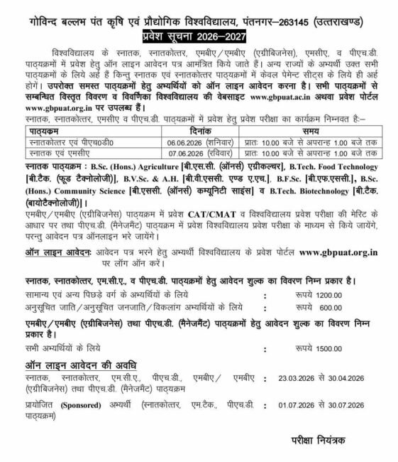 टिहरी गढ़वाल/पंतनगर। गोविंद बल्लभ पंत कृषि एवं प्रौद्योगिक विश्वविद्यालय, पंतनगर ने शैक्षणिक सत्र 2026–27 के लिए स्नातक, स्नातकोत्तर, एमबीए/एमबीए (एग्रीबिजनेस), एमसीए तथा पीएचडी पाठ्यक्रमों में प्रवेश हेतु अधिसूचना जारी कर दी है। विश्वविद्यालय ने सभी अभ्यर्थियों को ऑनलाइन आवेदन करने के निर्देश दिए हैं। विस्तृत जानकारी विश्वविद्यालय की आधिकारिक वेबसाइट और प्रवेश पोर्टल पर उपलब्ध है।
