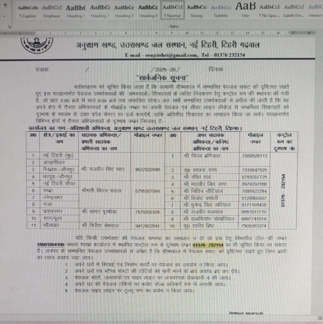 उन्होंने बताया कि उपभोक्ता अपने क्षेत्र में तैनात अभियंताओं के मोबाइल नंबरों पर पेयजल आपूर्ति एवं सीवर लाइन लीकेज से संबंधित शिकायतें दर्ज करा सकते हैं। साथ ही कंट्रोल रूम के माध्यम से भी शिकायत दर्ज कर त्वरित समाधान प्राप्त किया जा सकता है।